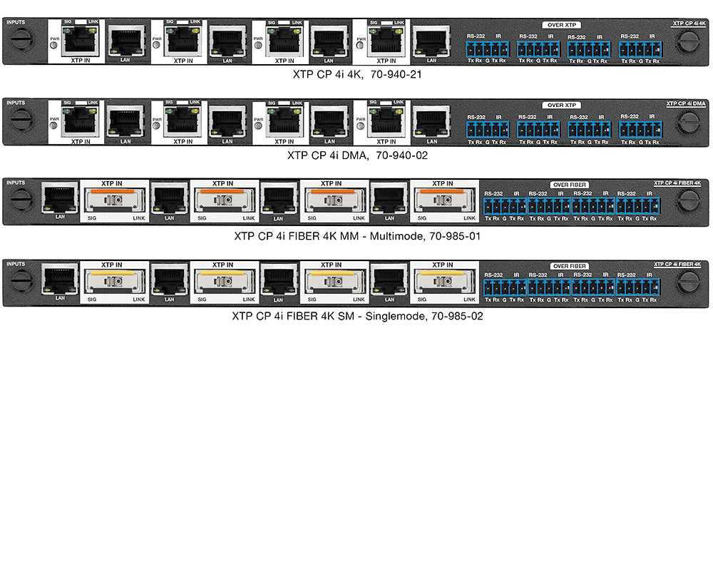 XTP CP Fiber 4K 輸入/輸出矩陣板提供行業標準 LC 型連接,并提供兩種格式:多模和單模。MM 型號支持 OM4 多模光纖,一般用在中等距離傳輸的建筑或設施內。SM 型號支持單模光纖,具有極長距離的傳輸能力。