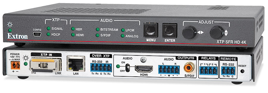 除了高性能視頻外,XTP SFR HD 4K 還可通過同一根電纜接收音頻信號。該圖像解析度轉換接收器能為 HDMI 嵌入的音頻提供信號分配,還能為多通道 S/PDIF 或兩通道平衡/非平衡模擬立體聲及 PCM 音頻提供音頻解嵌。為了準確控制音頻,接收器具有音量調整和靜音等功能。這樣就能靈活地簡化系統設計,減少終端之間的電纜數量。