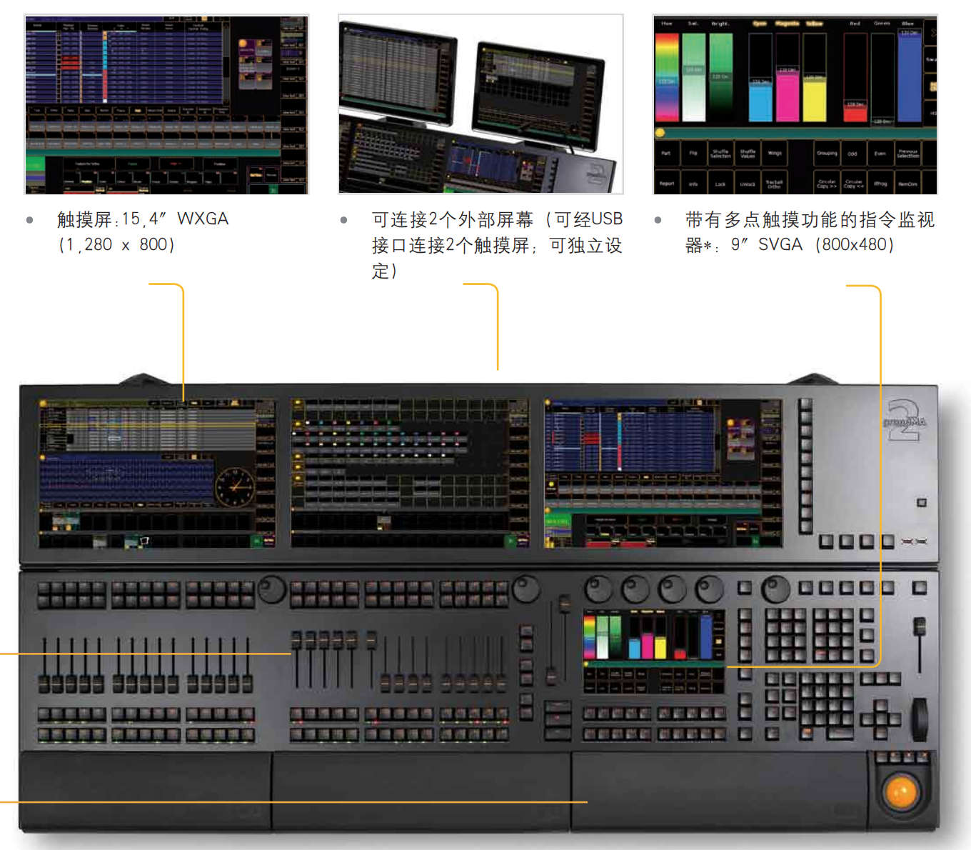 MA Lighting公司新的旗艦型控制臺是全規格 的grandMA2 full-size。該控制臺可控制各種 類型的燈光設備,如常規型燈具、移動燈、 LED燈、視頻及媒體數字燈