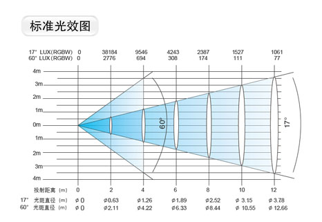 輸入電壓100V~240VAC,50 60Hz額定功率450W@220VLED光源功率20W(RGBW四合一)數量19顆額定壽命50000小時顏色RGBW線性混色,內置宏功能色溫色