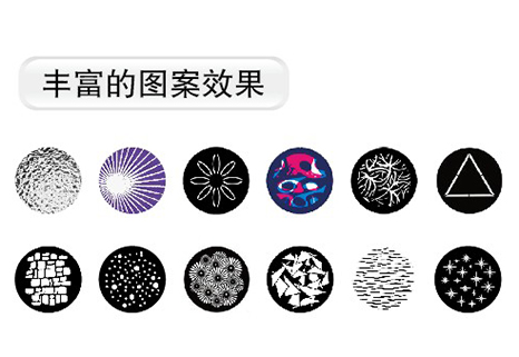 技術(shù)參數(shù):個顏色+白光半色效果,可變速雙向彩虹效果,步進 線性顏色轉(zhuǎn)換可選圖案1個固定圖案盤,1個旋轉(zhuǎn)圖案盤,有16個可更換圖案片(可