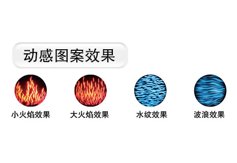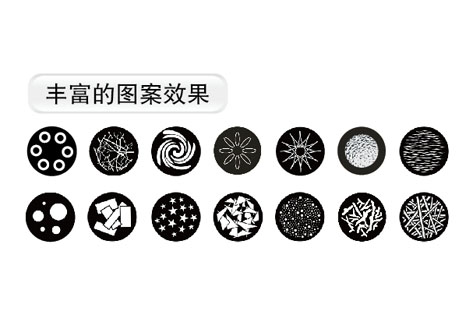 1個固定圖案盤,1個旋轉圖案盤,14個可更換圖案片(可選配),具有變速抖動效果、雙向變速流動效果