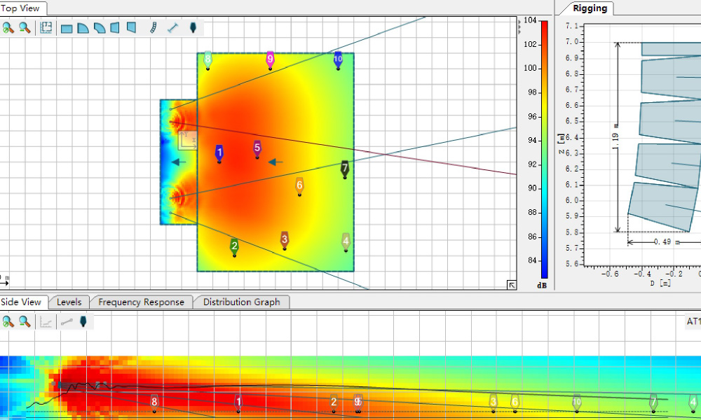 本項目的擴聲系統(tǒng)采用美國TOPP PRO品牌的線性陣列音 箱組成集中供聲,在體育場的主席看臺的左右兩邊各一組線 性陣列音箱,每組音箱由8只全頻音箱音箱組成,覆蓋整個全 場,在主席臺的左右側邊各由4只全頻音箱組成輔助補聲,覆 蓋主席臺的左右側的看臺區(qū),這樣整個體育場都被聲音覆蓋, 由于線性音箱的擴聲原理,滿足聲投射距離達到約80米 遠的需求,我們應用了EASE-Focus軟件模擬計算,并通過實 地測試聲壓級、語言清晰度、無線話筒的傳輸?shù)葷M足聲 場需求。