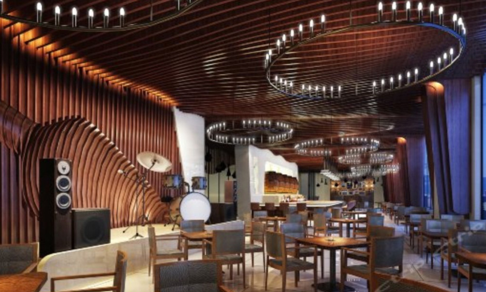 4、酒吧:滿足現(xiàn)場(chǎng)樂隊(duì)演出,系統(tǒng)配置德國(guó)Dynacord音 響系統(tǒng)、美國(guó)SHURE話筒、舞臺(tái)燈光系統(tǒng)。