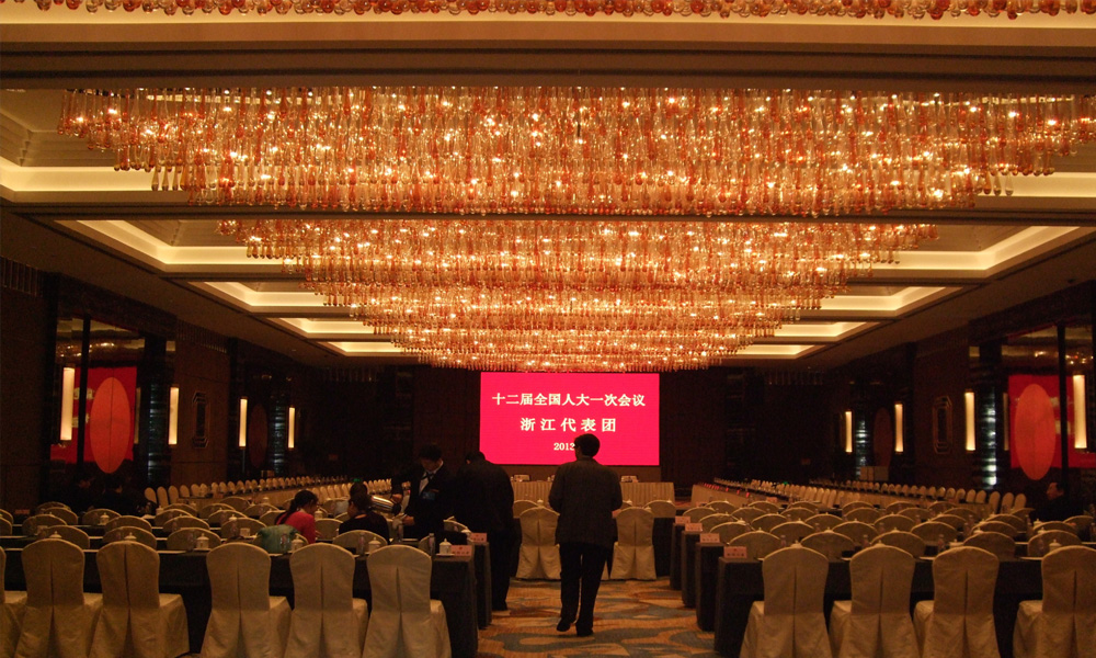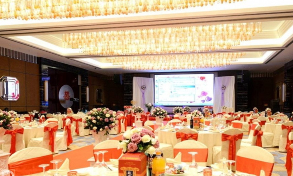 1、宴會大廳:滿足婚慶、報告型會議、文藝表演、高清視 頻展播、新聞發布、教學培訓等,系統采用:美國Ev音響 系統、美國SHURE無線話筒、P4高清LED大屏幕、智能控制 系統。